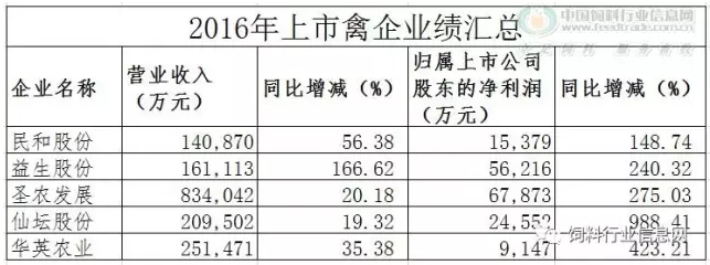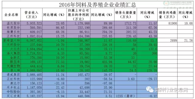 表1 2016年饲料及养殖企业业绩汇总