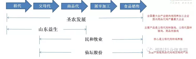4、 从图1业务范围可以看出,圣农的业务涉及从祖代到鸡肉产品全产业链,而且圣农是全国最大的全产业链肉鸡饲养加工企业,也是国内商品代鸡产量最大的企业;益生是从祖代到商品代肉鸡的饲养和销售;民和、仙坛的业务板块均为从父母代到鸡肉产品的加工销售,但不同的是民和的核心是父母代肉鸡养殖,仙坛的核心是商品代肉鸡及鸡肉产品;