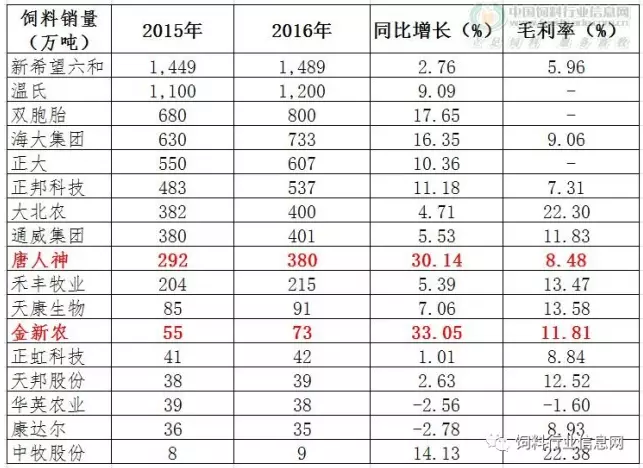2、 金新农和唐人神2016年饲料销量同比增长最快,均超过30%